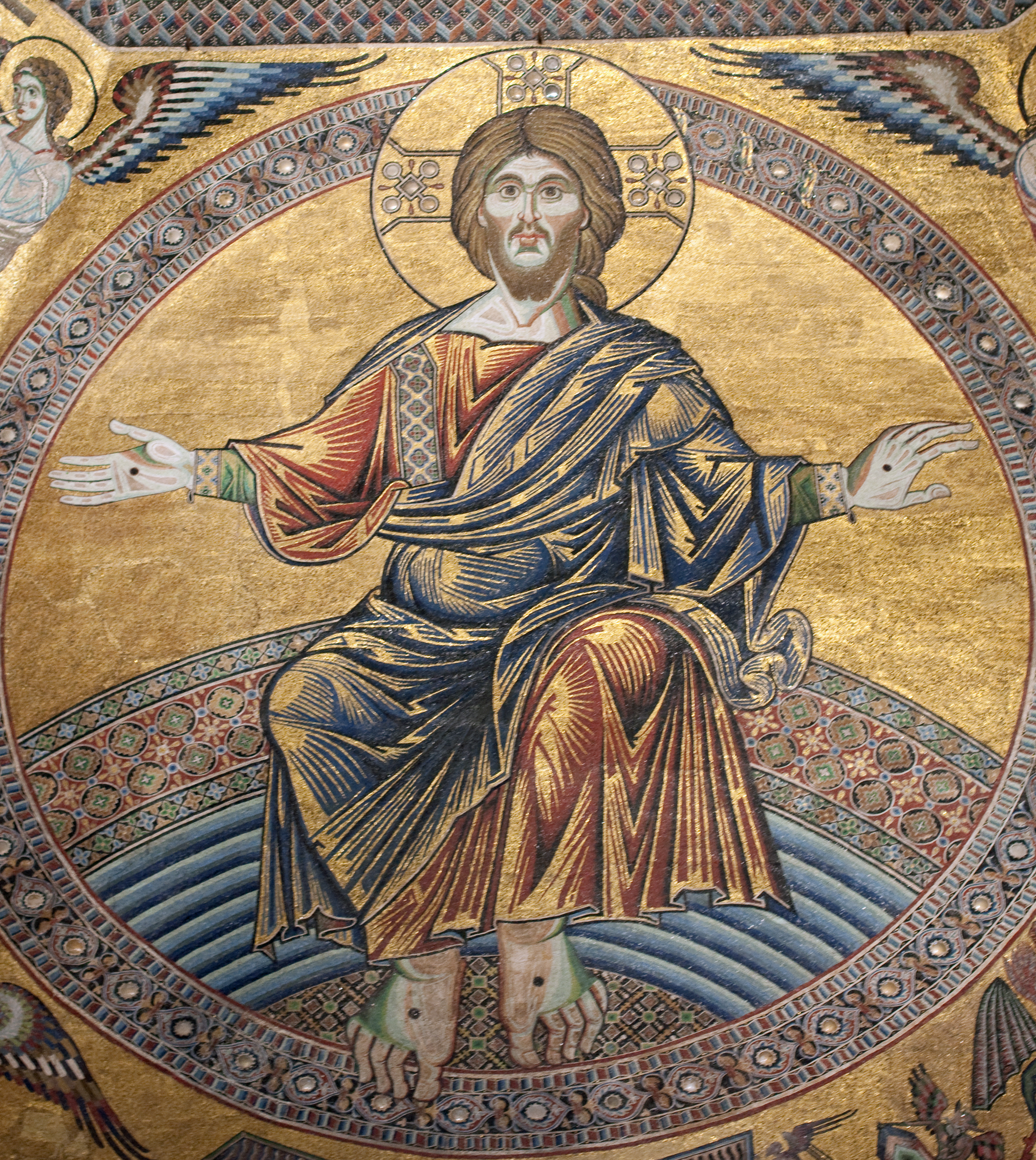 I’ll leave the visit to the library for another day. These two images of Annigoni and Masaccio are taken off the web as neither church would allow photography, even without flash. However, when I passed the baptistery next to the Duomo and found that there wasn’t a queue, I seized the opportunity and went in to see the medieval mosaics which cover the domed ceiling (I couldn’t find a font let alone a baptistery – but that’s another story). The dome is covered with scenes portraying the Last Judgement – and some of pretty scary. But the eye is inevitably drawn to Christ enthroned on the judgement seat. It wasn’t easy to see some of the detail from the ground as the mosaic of Christ must be 40-50 feet up, but when I had taken my photographs and inspected them on the laptop I saw very clearly the scars of the nails on his hands and feet. The one who judges is the one who has laid down his life for the redemption of the world. Whatever our views or expectations of the judgement are we must hold on to this central affirmation and hope – the judge is the one who has washed disciple’s feet, lifted fallen sinners out of the dust and died for our salvation. Images and phrases tumble after one another – Here is love vast as the ocean – the lamb that was slain sits on the throne – but especially: Kyrie eleison, Christe eleison, Kyrie eleison – Lord have mercy.